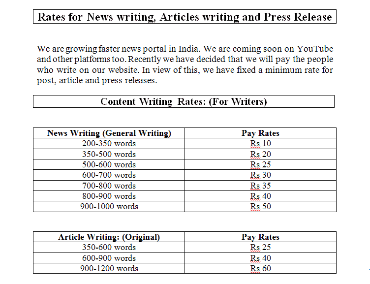 We are growing faster news portal in India. We are coming soon on YouTube and other platforms too. Recently we have decided that we will pay the people who write on our website. In view of this, we have fixed a minimum rate for post, article and press releases.